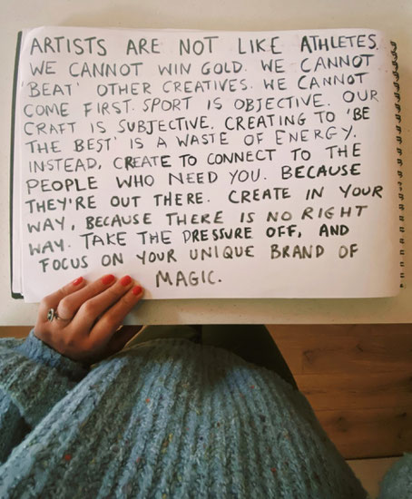"Künstler sind nicht wie Sportler. Wir können kein Gold gewinnen. Wir können andere Kreative nicht "schlagen". Wir können nicht zuerst kommen. Sport ist objektiv. Unser Handwerk ist subjektiv. Etwas zu schaffen, um "der Beste" zu sein, ist Energieverschwendung. Erstelle stattdessen eine Verbindung zu den Menschen, die dich brauchen. Weil diese da draußen sind. Erschaffe etwas auf deine Art, denn es gibt keine "richtige" Art. Nimm den Druck raus und konzentrier dich auf deine ureigene Art von Magie."