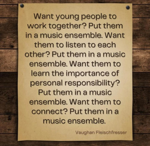 "Sie möchten, dass junge Menschen zusammenarbeiten? Dann stecken Sie sie in ein Musik-Ensemble. Sie möchten, dass sie einander zuhören? Dann stecken Sie sie in ein Musik-Ensemble. Sie möchten, dass sie lernen, wie wichtig persönliche Verantwortung ist? Dann stecken Sie sie in ein Musik-Ensemble. Sie möchten, dass sie Kontakte knüpfen? Dann stecken Sie sie in ein Musik-Ensemble."